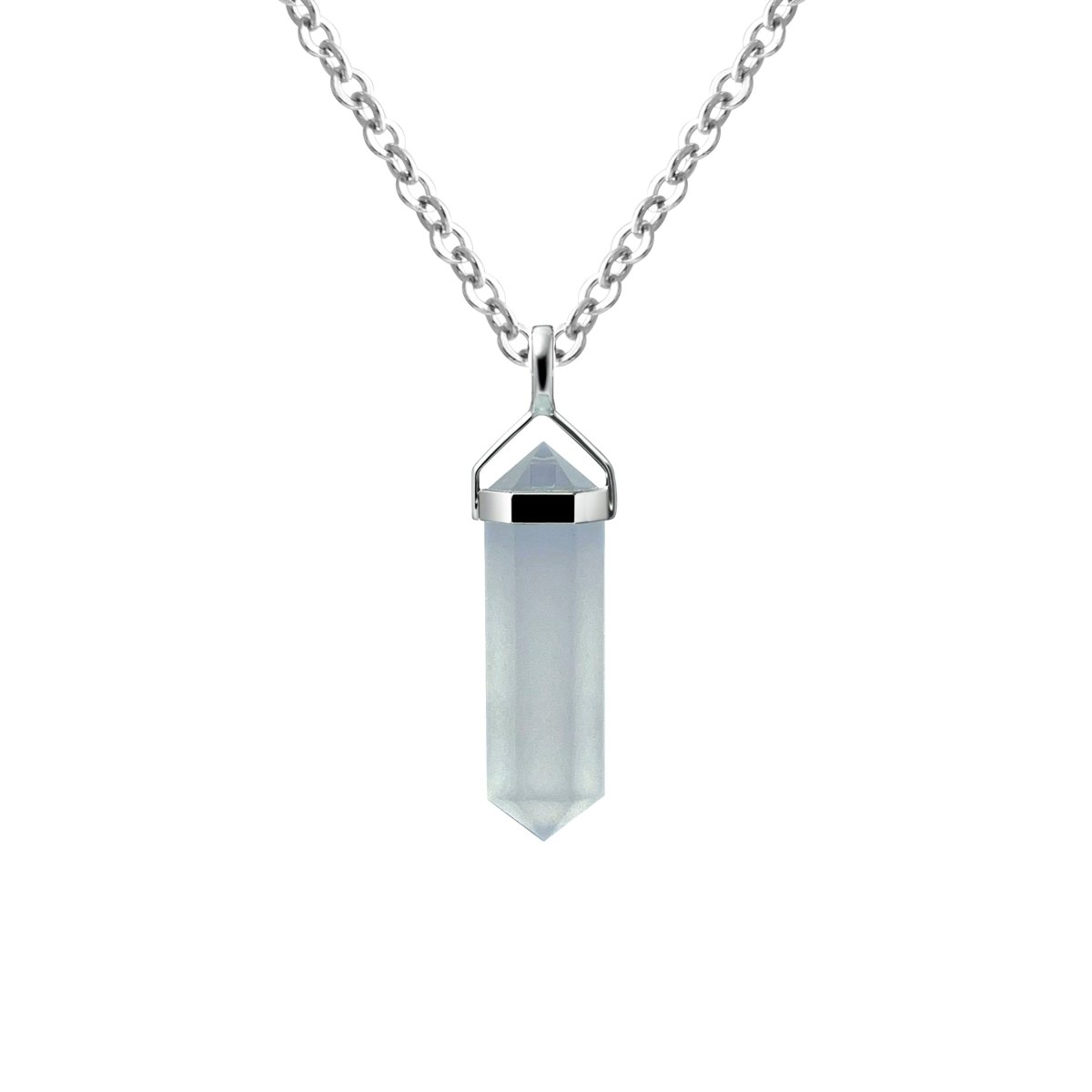 Dainty Pale Blue Chalcedony Gemstone Double point pendant necklace set with 925 Sterling Silver. Our Sterling Silver is Rhodium plated to keep it shiny. A delicate light blue coloured gemstone...