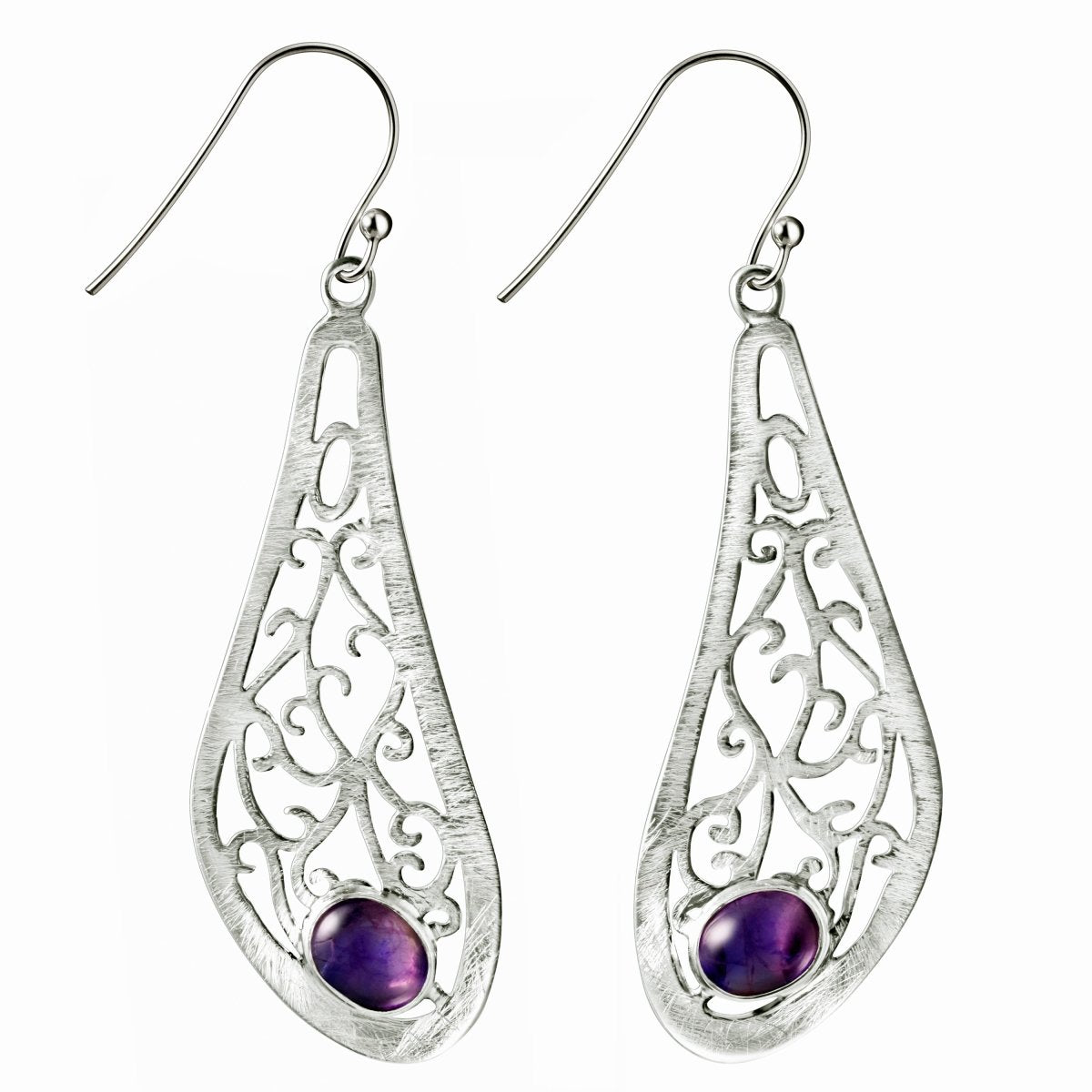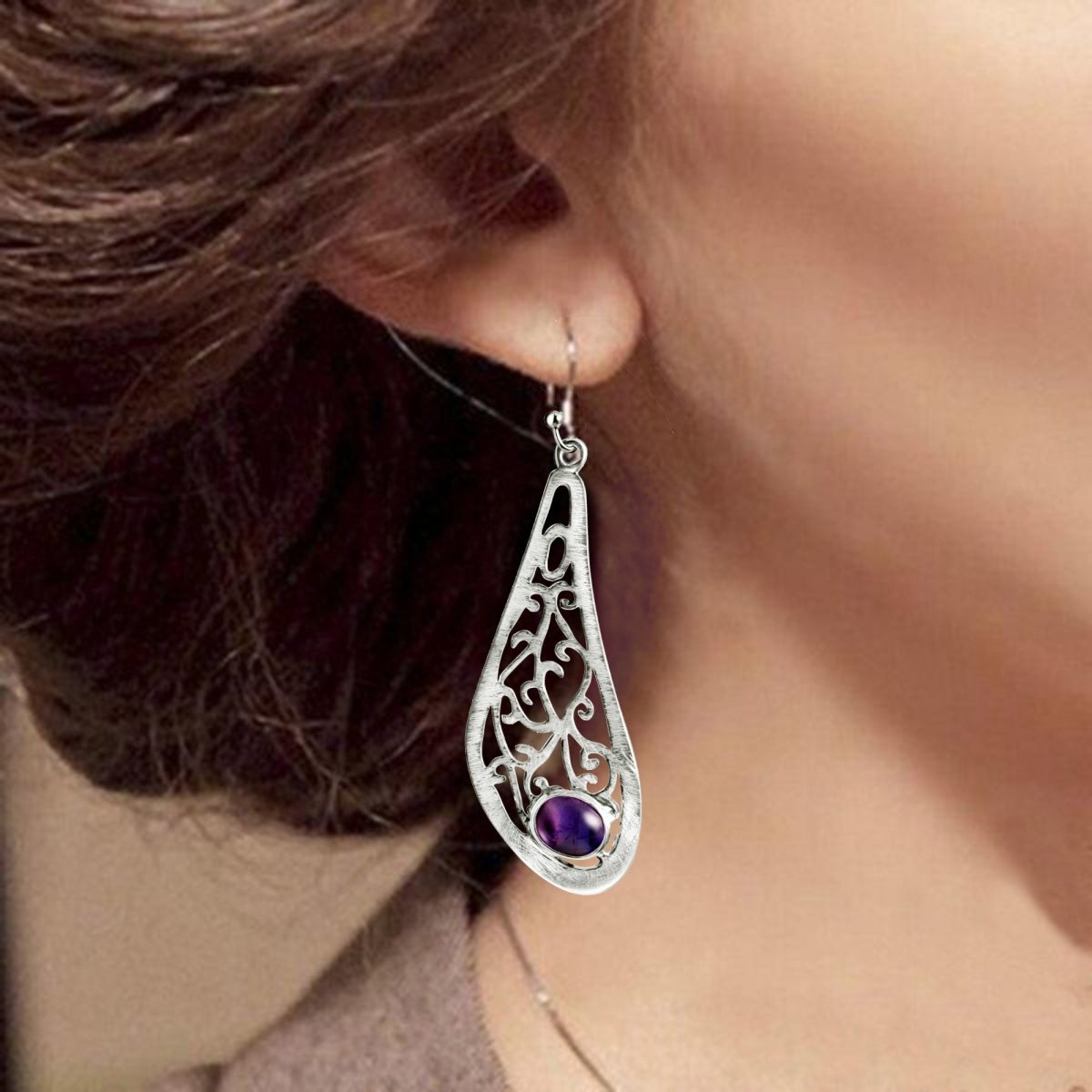 Tear drop shaped beaten 925 Sterling Silver with a fine cut out filigree design and a natural Amethyst gemstone set at the base. These are unusual, handmade, long and pretty...