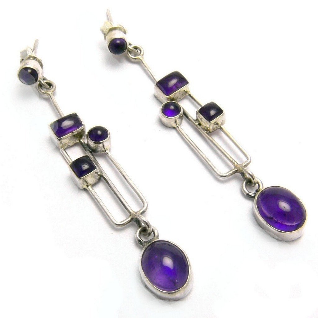 Unusual drop earrings presented in the Arts and Crafts style with cabochon cut purple Amethyst gemstones set in brushed 925 Sterling Silver. Stunning and different and very popular. These earrings...