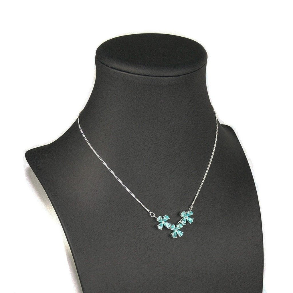 A very pretty and delicate necklace of sparkling simulated Aquamarine (Cubic Zirconia) and 925 Sterling Silver. Three silver flowers hang from a delicate 925 Sterling Silver chain. For matching earrings search for sku 605. Excellent value and an ideal gift! Necklace length:41cms/16inches.