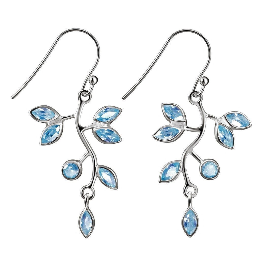 These faceted blue simulated Aquamarine (Cubic Zirconia) earrings set in pretty vine leaf shaped 925 Sterling Silver setting twinkle and catch the eye. Matching necklace available sku 6253. Length:5cms/2inches. Comes in a pretty box.