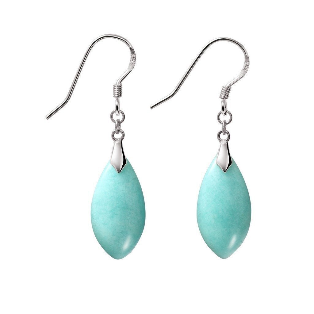 Beautiful, elegant, dainty earrings featuring natural turquoise coloured Amazonite gemstones in a leaf shape set in 925 Sterling Silver. Light weight and easy to wear all day. Gemstone quality: A. Earrings length: 4cm.