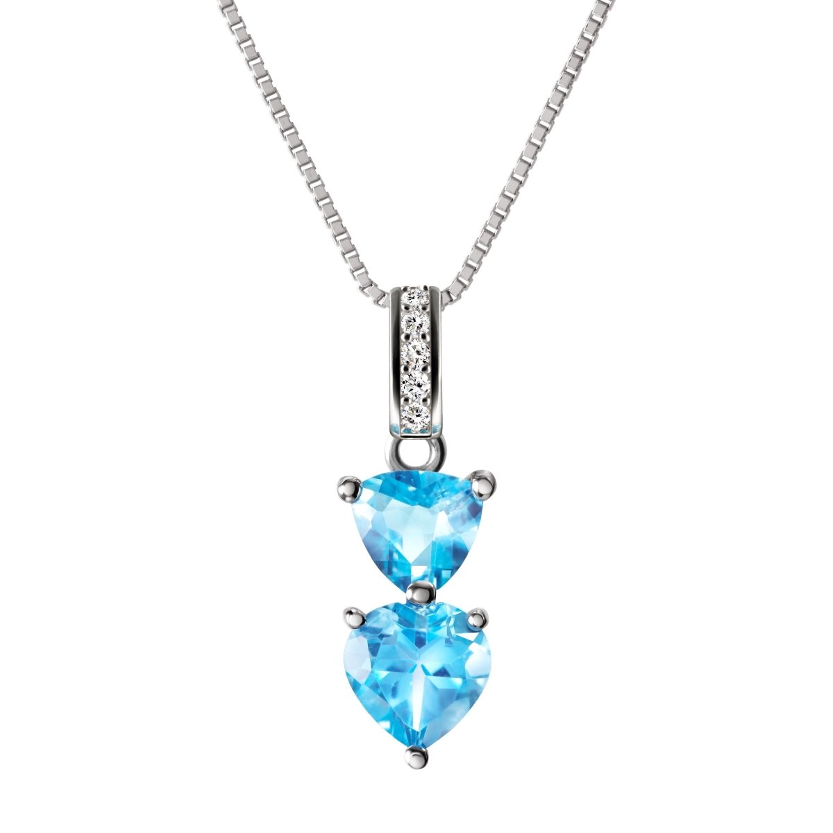 Beautiful facetted natural blue Topaz gemstone & Sterling Silver pendant necklace. The two heart shaped blue Topaz gemstones look beautiful on this simple elegant necklace. There are 2 gemstones cut in the shape of hearts hanging below a bale studded with CZ which add sparkle. Simple and elegant. Nickel free. Comes in pretty box. Pendant Length: 5/6mm. Chain length: 50cm.